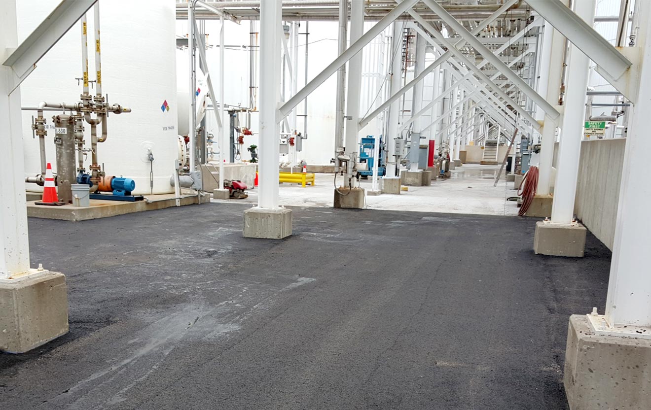 Excavation Around Safety-Sensitive Areas, New Concrete and Asphalt Paving Inside Containment BunkerTessenderlo Kerley hired Encore Pavement to complete a very safety-sensitive and complex project inside of their storage containment bunker, as their walking surface was riddled with potholes and trip hazards. Our crews performed meticulous and careful excavation around tanks, valves and piping located underground and overhead. We developed and successfully executed a very detailed safety and phasing plan to completely replace all of the concrete and asphalt paving within the facility— all while keeping the customer fully operational throughout the project.